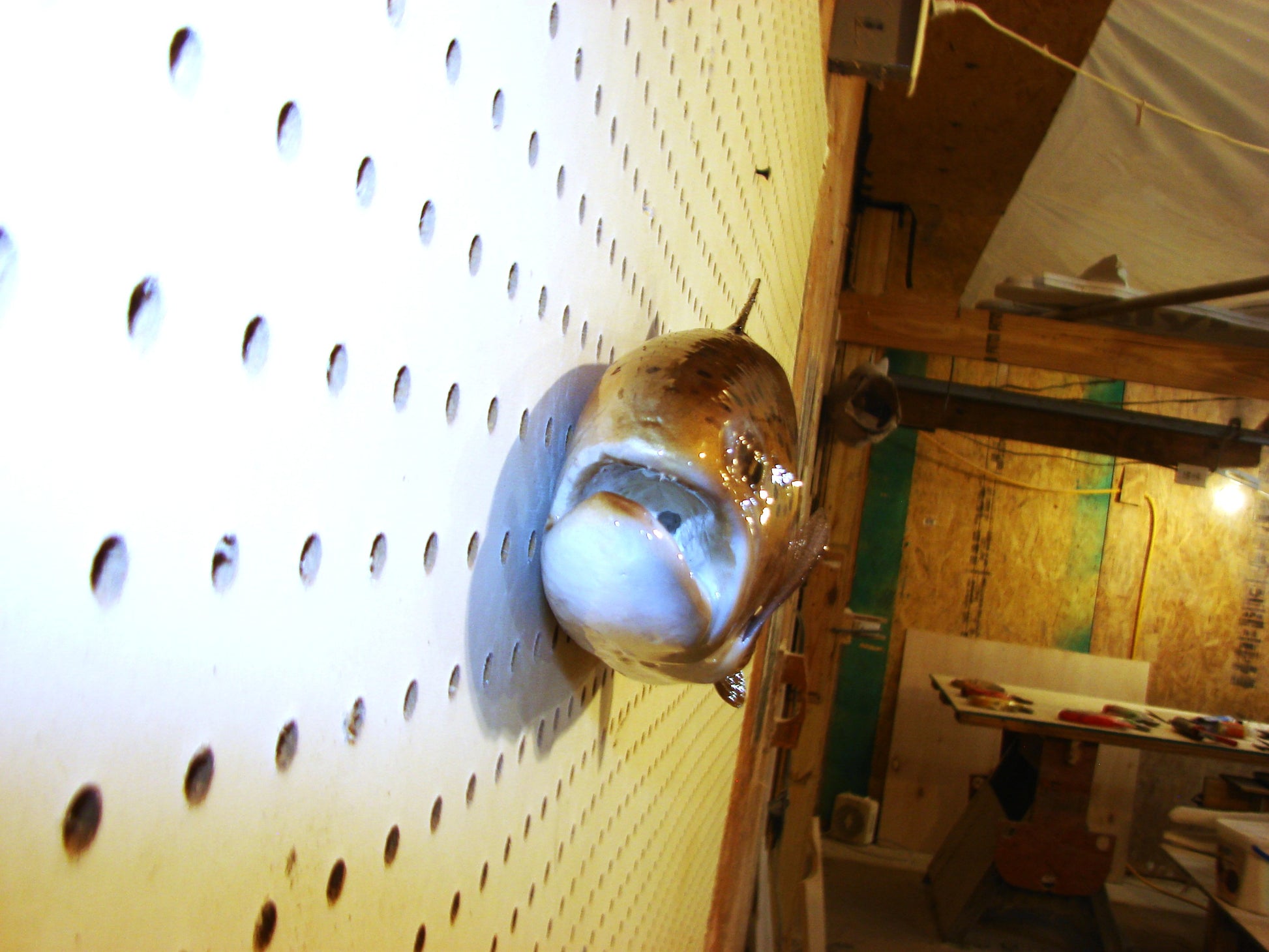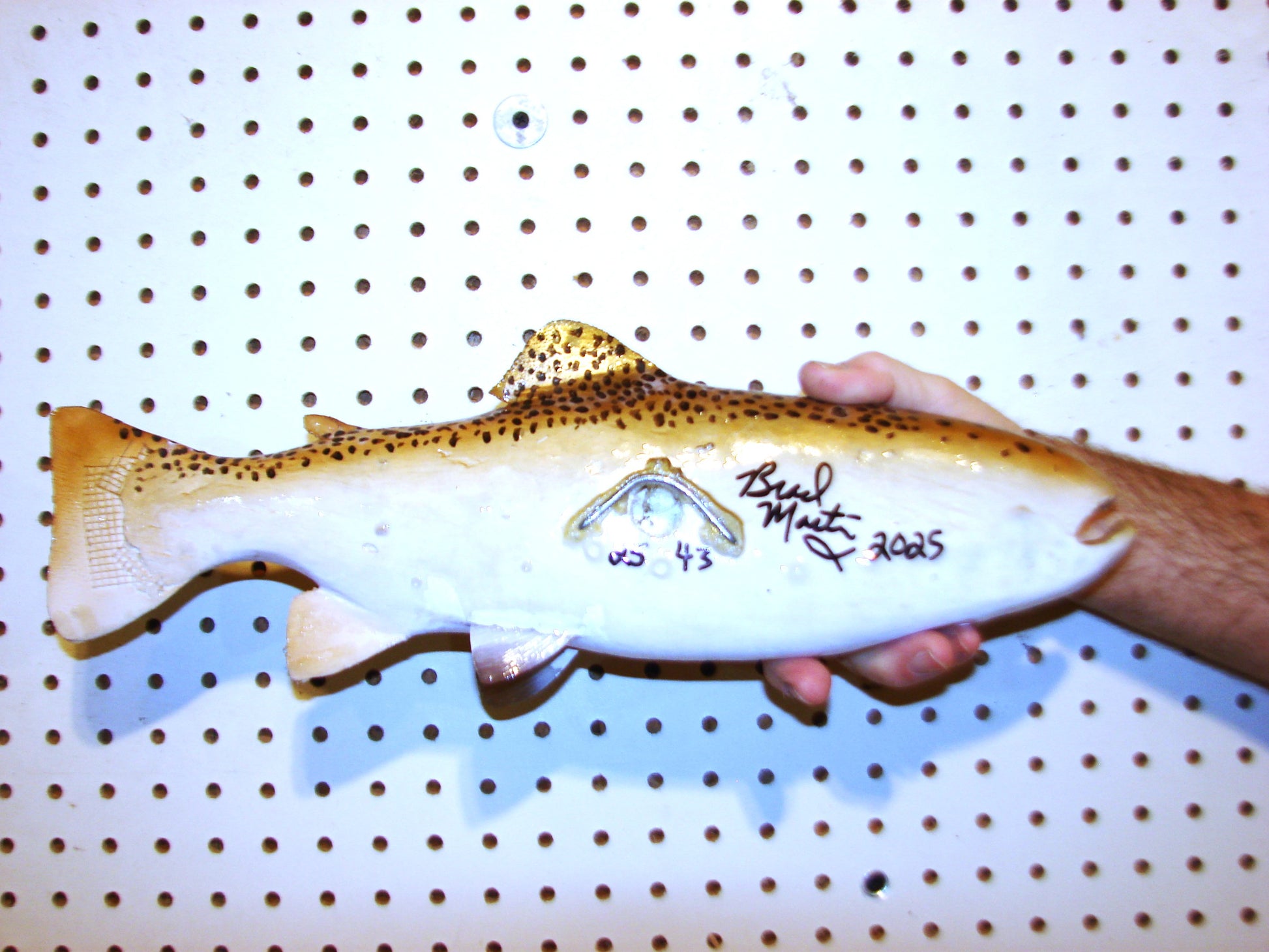 This Trout is approximately 17" long, 6" tall, and 2" from the wall. I sculpted this brown from polystyrene foam, plaster, and epoxy resins. I carved the details by hand into the plaster, and carved the fins by hand from one or more of the following; HDPE plastic sheets, HDPE plastic repurposed from buckets, lids, etc. or from acrylic sheets. It is reinforced with fiber mesh, and steel wire. It is comparable to a fiberglass replica in every way. It is light, strong, and easily hangs on a single nail via the hole in back at its center of gravity.