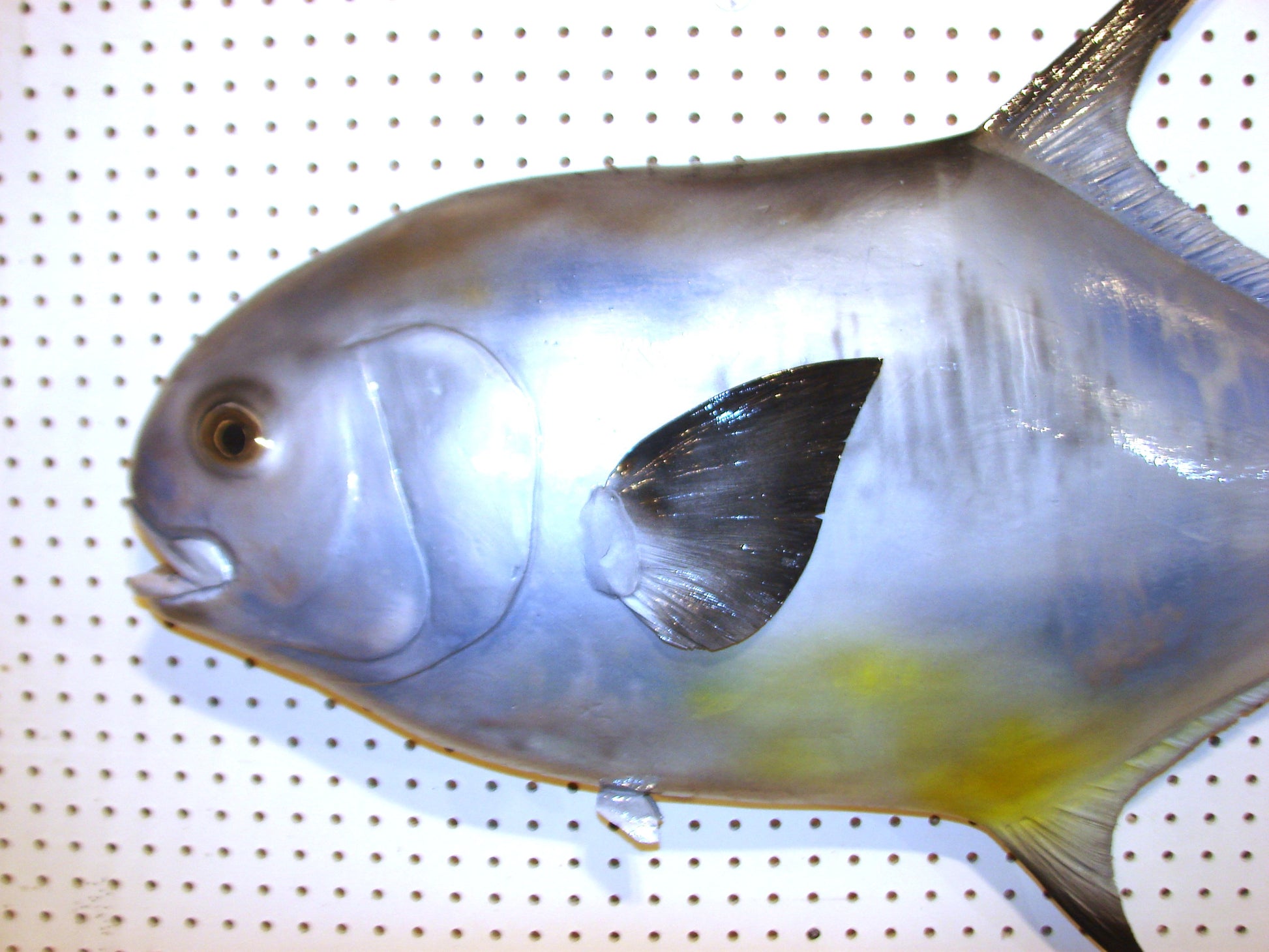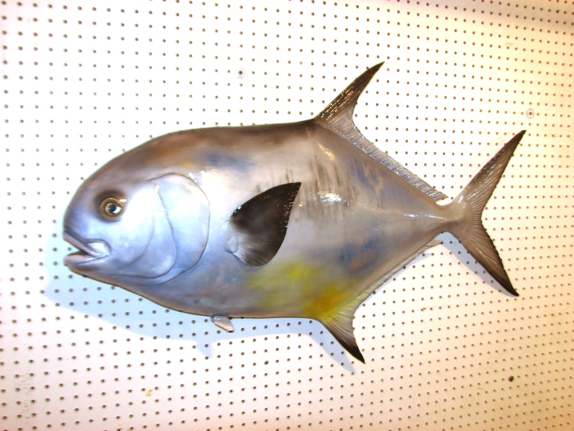 This permit is approximately 42" long (TOTAL LENGTH, TIP-T0-TIP), 25" tall, and 6" from the wall. I sculpted it from polystyrene foam, plaster, and epoxy resins. I carved the details by hand into the plaster, and carved the fins by hand from HDPE plastic from recycling plastic buckets, from HDPE sheets, acrylic sheets, or a combination of these materials. It is reinforced with fiber mesh, and steel wire. It is comparable to a fiberglass replica in every way. It is light, strong, and easily hangs on a single nail via the hole in back at its center of gravity.