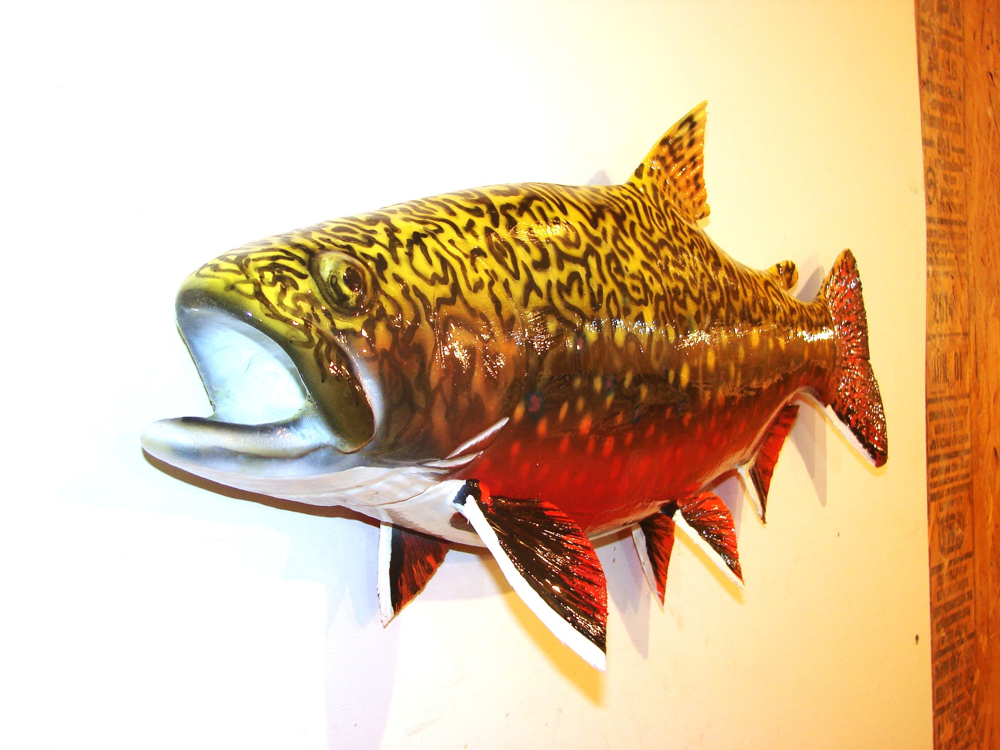 This Trout is approximately 24" long, 9" tall, and 3" from the wall. I sculpted this brown from polystyrene foam, plaster, and epoxy resins. I carved the details by hand into the plaster, and carved the fins by hand from one or more of the following; HDPE plastic sheets, HDPE plastic repurposed from buckets, lids, etc. or from acrylic sheets. It is reinforced with fiber mesh, and steel wire. It is comparable to a fiberglass replica in every way. It is light, strong, and easily hangs on a single nail via the hole in back at its center of gravity.