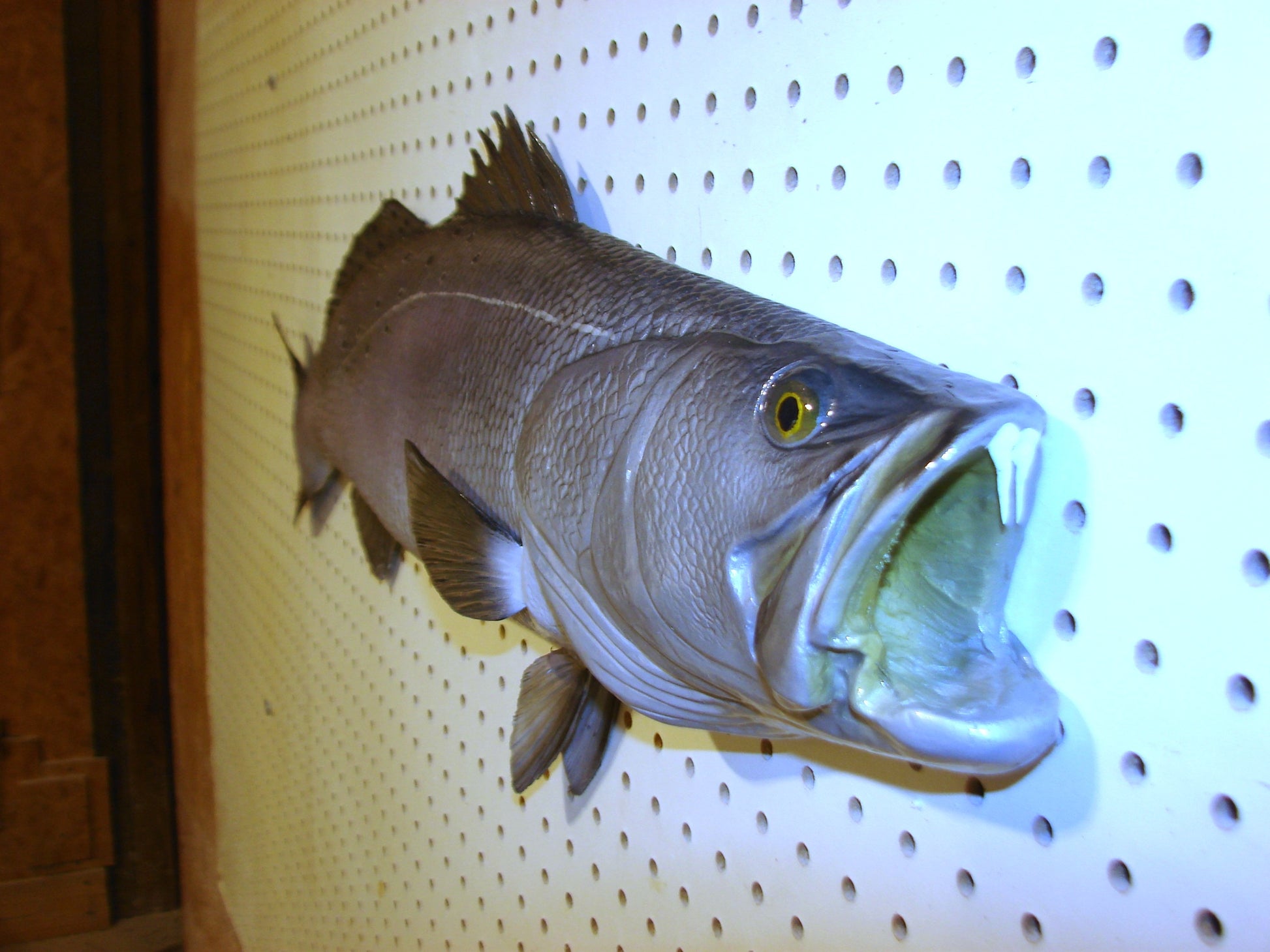 This Speckled trout is approximately 32" long, 11" tall, and 2" from the wall. I sculpted it from polystyrene foam, plaster, and epoxy resins. I carved the details by hand into the plaster, and carved the fins by hand from HDPE plastic from recycling plastic buckets. It is reinforced with fiber mesh, and steel wire. It is comparable to a fiberglass replica in every way. It is light, strong, and easily hangs on a single nail via the hole in back at its center of gravity.