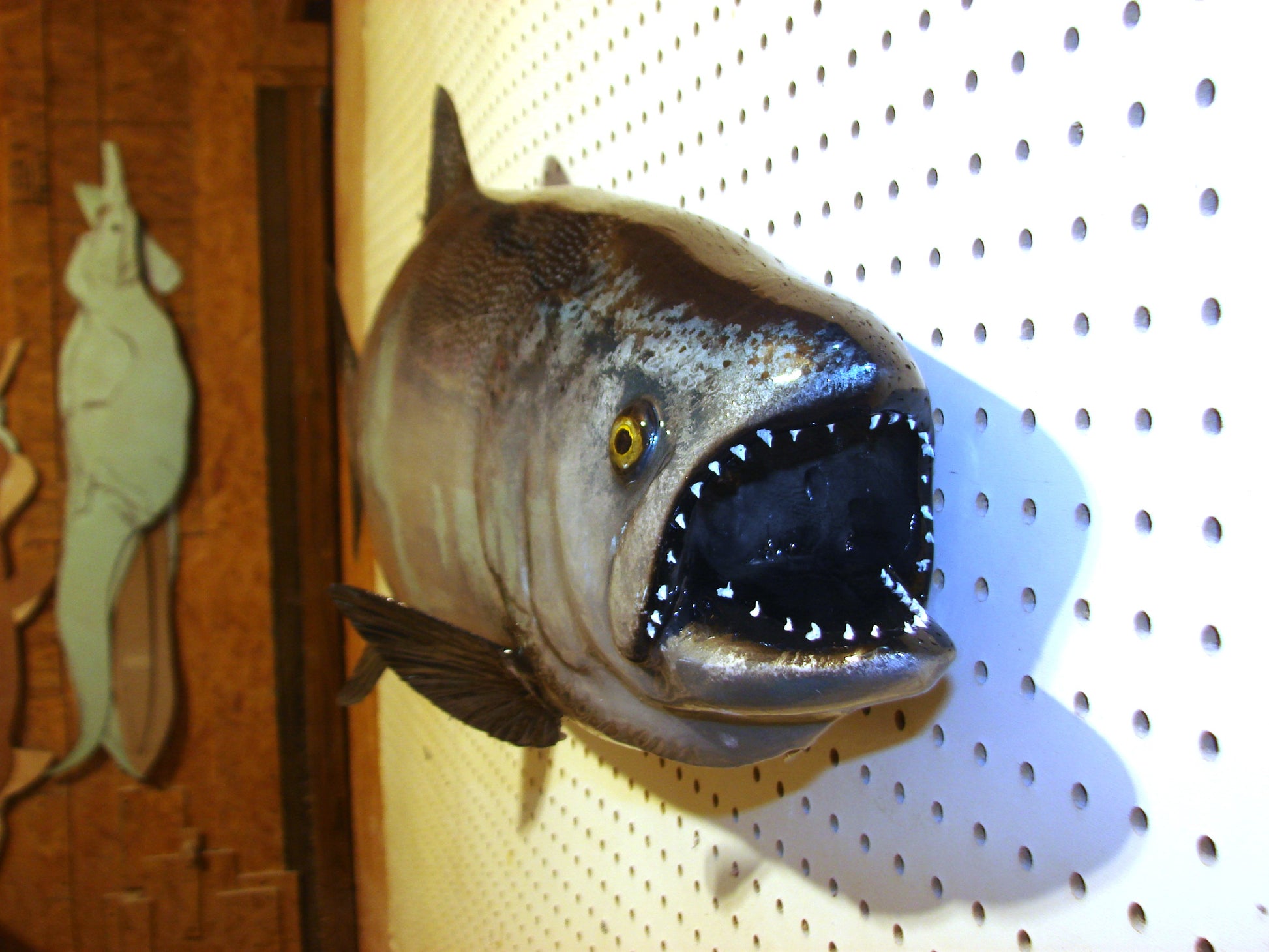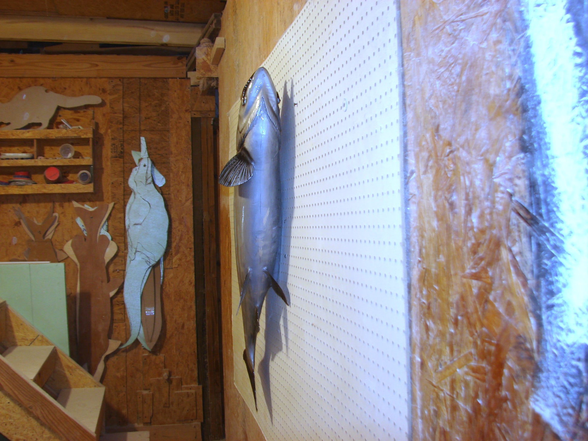 This Chinook King Salmon is 41" long, and approximately,16" tall, and 7" from the wall. I sculpted it from polystyrene foam, plaster, and epoxy resins. I carved the details by hand into the plaster, and carved the fins by hand from HDPE plastic from recycling plastic buckets as well as fresh HDPE sheets. It is reinforced with fiber mesh, and steel wire. It is comparable to a fiberglass replica in every way. It is light, strong, and easily hangs on a single nail via the hole in back at its center of gravity.