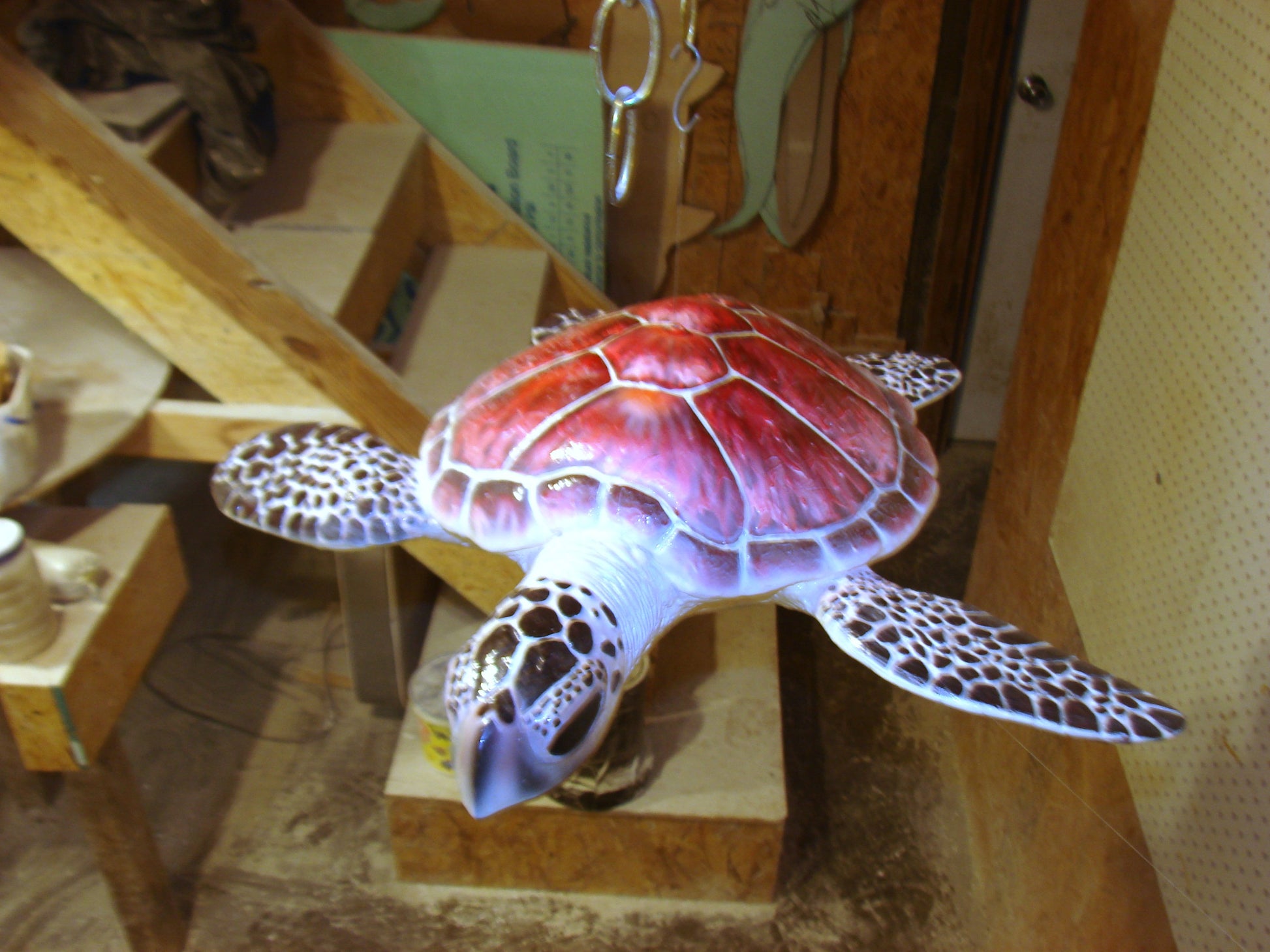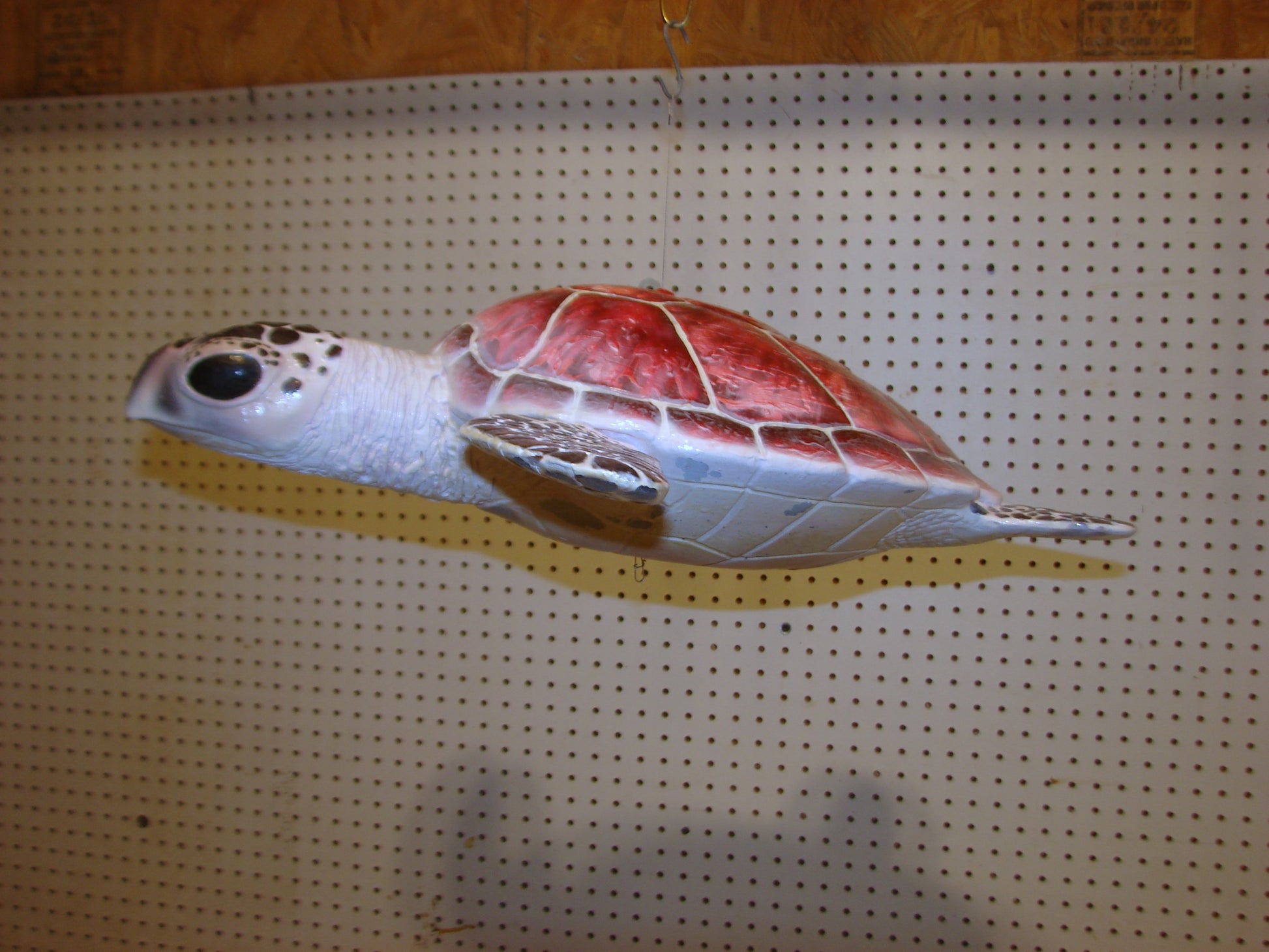 This Sea Turtle is approximately 22" long, 24" wide, 6" thick (the shell is about 15"x13") and it weighs about 7 lbs. I sculpted this beautiful creature from polystyrene foam, plaster, and epoxy resins. It hangs from a single point, a 30lb-test steel cable fishing leader, but you can easily add a second or 3rd light monofilament line to change the angle, and/or to establish a fixed position. Look closely and you might be able to see that I did just that in some of these photos.